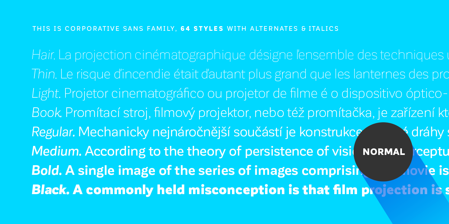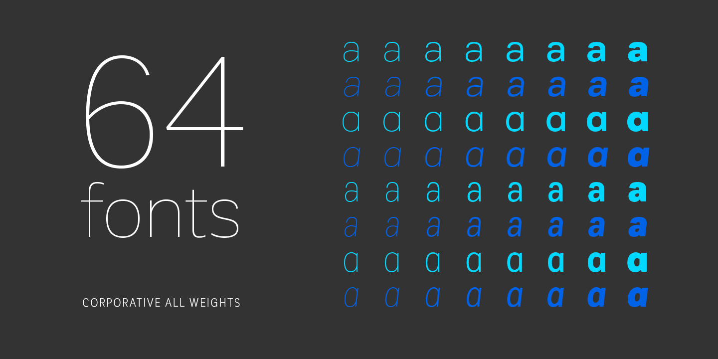Corporative Sans typeface is developed by Latinotype Team. Corporative Sans is the new version of Corporative. This font has a marked personality and distinctive traits, what makes it suitable to be used at large text sizes. Since it is a condensed font, it can also be used in smaller sizes. Corporative comes with the Latinotype’s standard set of 350 characters, making it possible to use the font in 128 different languages. Corporative provides users with a wide range of characters, weights and widths for every project. By combining different variants, designers can achieve the best results. Latinotype has added new faces to its team. Latinotype Team now comprises: Rodrigo Fuenzalida, César Araya, Bruno Jara, Luciano Vergara and Daniel Hernández. Corporative was created by Latinotype Team and developed by Javier Quintana, Rodrigo Fuenzalida and César Araya, under the supervision of Luciano Vergara and Daniel Hernández.