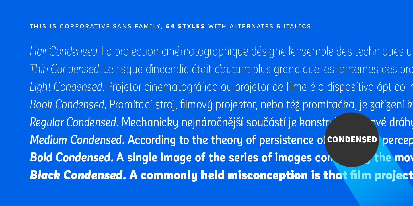 Corporative Sans typeface is developed by Latinotype Team. Corporative Sans is the new version of Corporative. This font has a marked personality and distinctive traits, what makes it suitable to be used at large text sizes. Since it is a condensed font, it can also be used in smaller sizes. Corporative comes with the Latinotype’s standard set of 350 characters, making it possible to use the font in 128 different languages. Corporative provides users with a wide range of characters, weights and widths for every project. By combining different variants, designers can achieve the best results. Latinotype has added new faces to its team. Latinotype Team now comprises: Rodrigo Fuenzalida, César Araya, Bruno Jara, Luciano Vergara and Daniel Hernández. Corporative was created by Latinotype Team and developed by Javier Quintana, Rodrigo Fuenzalida and César Araya, under the supervision of Luciano Vergara and Daniel Hernández.