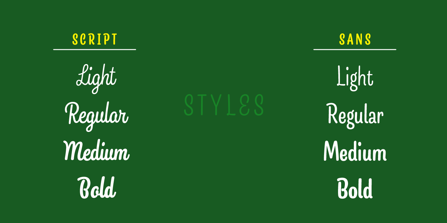 There are four weights in both sans and script, from the elegant Extra Light to the attention grabbing Bold weight.